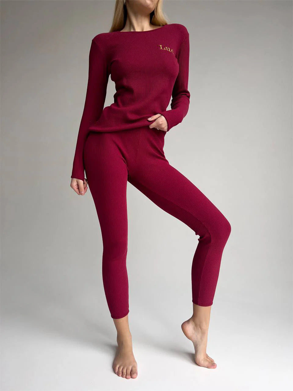 EASE 2 Piece Ribbed Cotton Loungewear - Claret Red
