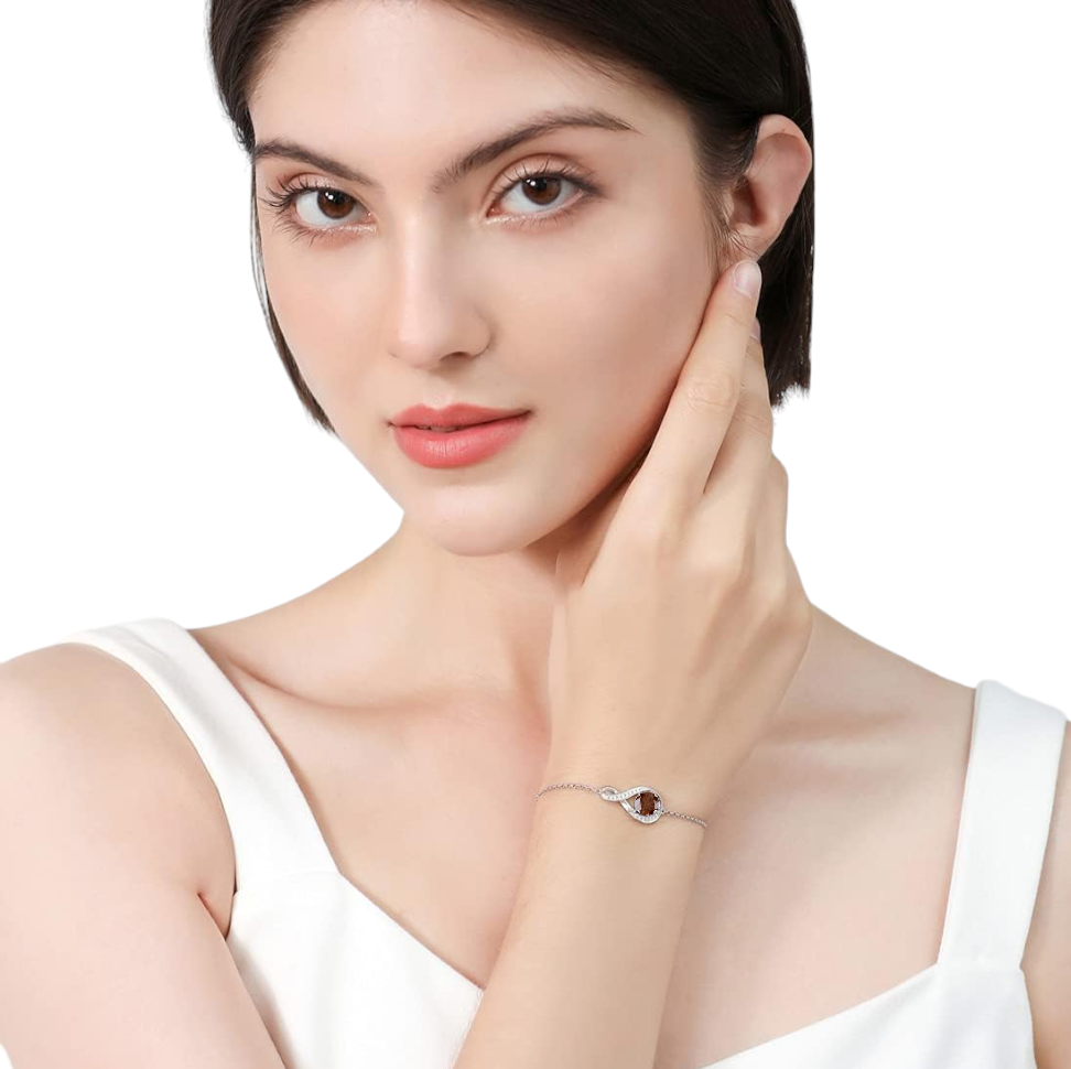 Our stunning 925 sterling silver infinity bracelet adorned with the June birthstone, brown moonstone. The bolo design...