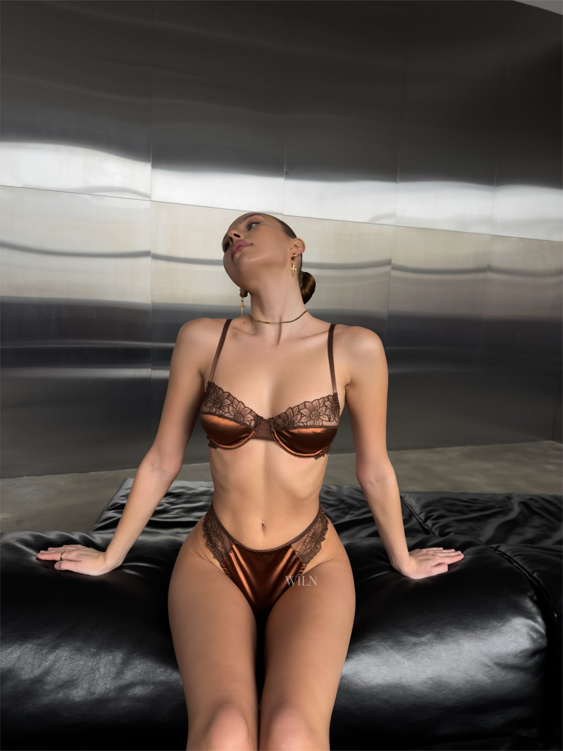 The underwire bralette bra offers gentle support and a flattering lift, while the high-waisted thong sculpts and elongates the silhouette, creating a look that feels as powerful as it is sensual.