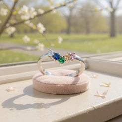 A modern classic with a colourful twist, our Rainbow Wishbone Ring is crafted from polished 925 sterling silver and adorned with a graceful V-shape of rainbow coloured cubic zirconia stones. Symbolising luck, love, and positivity, this elegant ring makes a beautiful gift or a meaningful addition to your everyday jewellery.